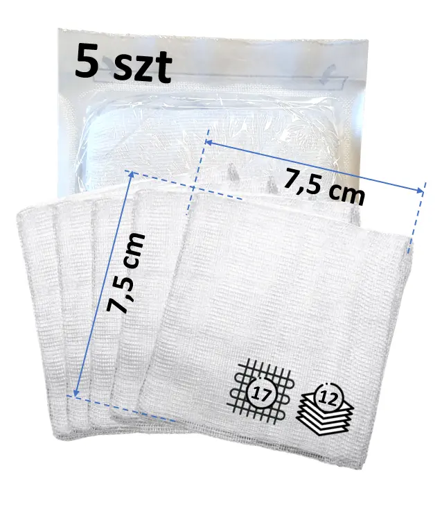 Kompresy jałowe z gazy 12 warstw 17 nitek 5 sztuk w torebce